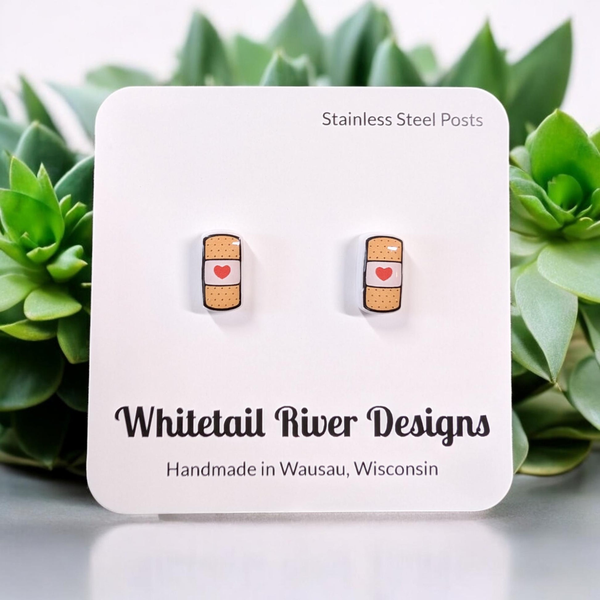 Bandage with Heart Acrylic Post Stud Earrings with Stainless Steel Posts