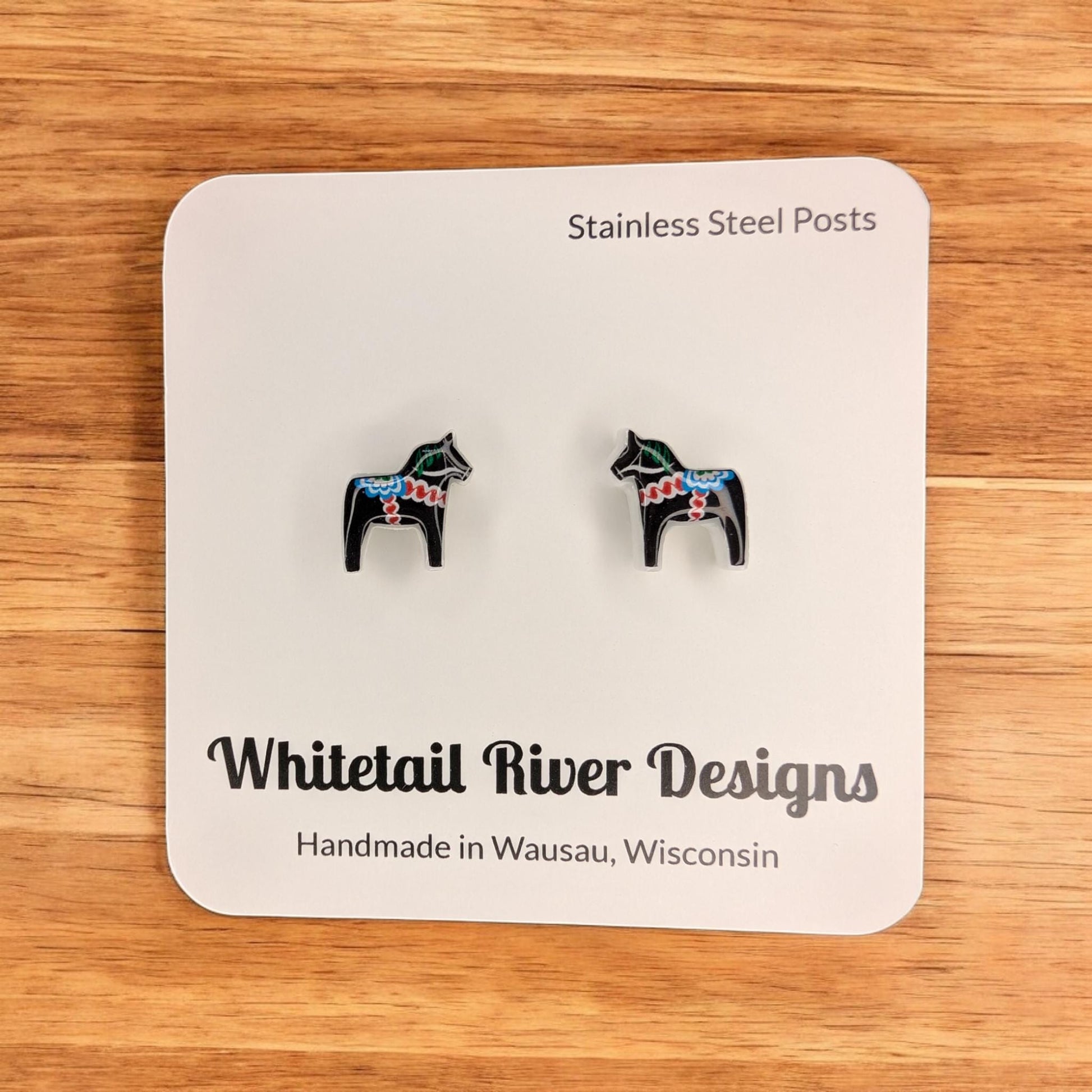 Black Dala Horse Acrylic Post Stud Earrings with Stainless Steel Posts - Updated Style