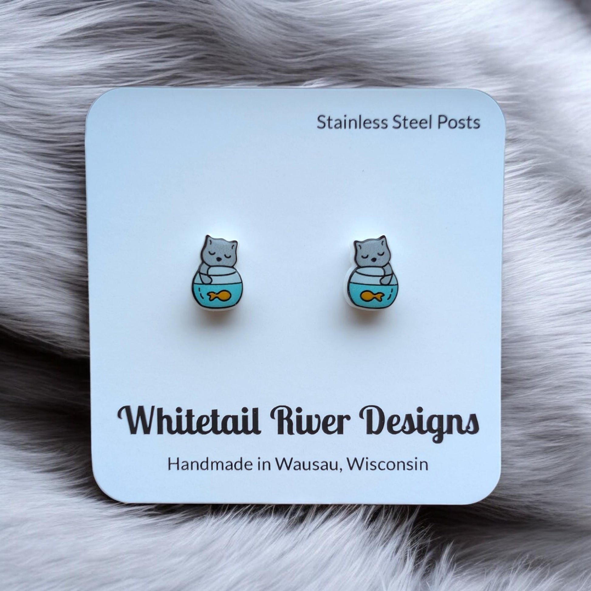 Cat and Goldfish Bowl Acrylic Earrings with Stainless Steel Posts